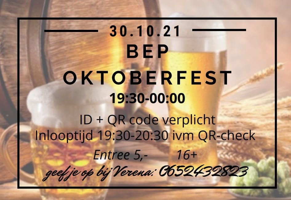 Het “BEP OktoberFest 2021” wordt dit jaar gehouden op zaterdag 30 oktober, van 19.30 tot 00.00! Geef je op bij Verena 0652432823 . ID + QR-code is verplicht!