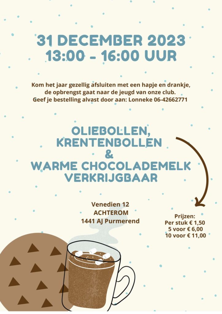 Je kunt alvast je bestelling voor oliebollen of krentenbollen doorgeven. Ook is er op 31 december warme chocomelk verkrijgbaar.