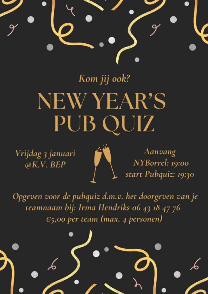 We beginnen het nieuwe jaar goed bij onze club met een gezellige New Year’s Pubquiz! Zin in een avond vol plezier, uitdaging en een vleugje competitie? Kom dan op vrijdag 3 januari naar onze kantine en doe mee met jouw team!