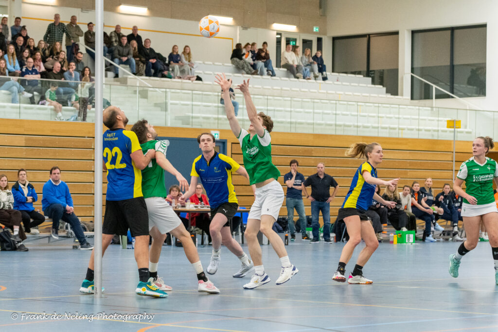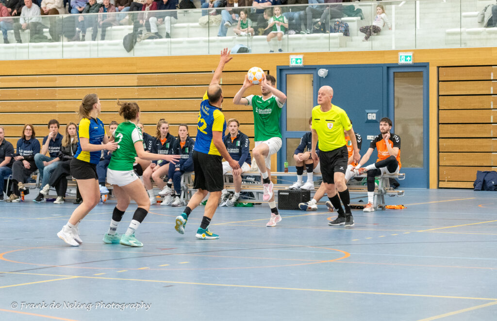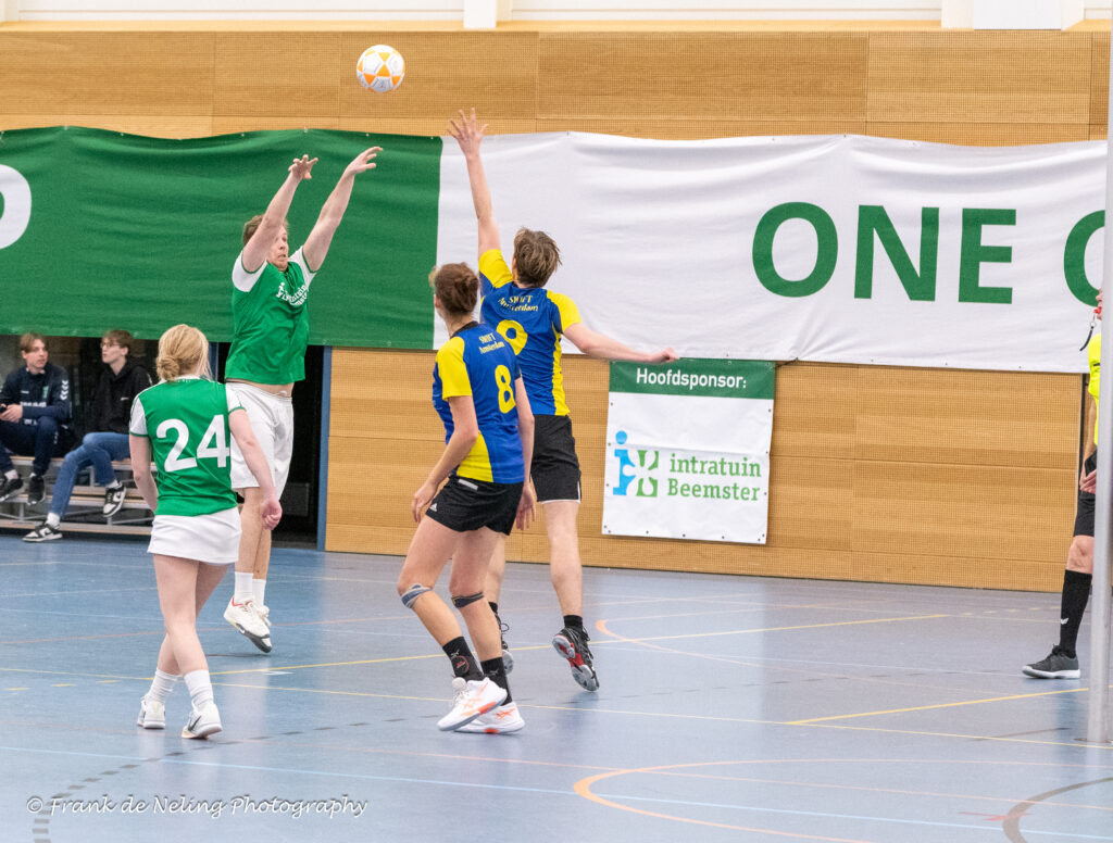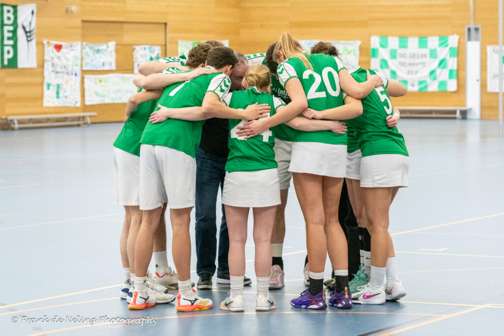 In de rust was het vrij duidelijk. Alles moest beter. Verdedigend moest het scherper en aanvallend moesten we duidelijker zijn naar elkaar en de juiste kansen nemen. We waren te gehaast aan het spelen waardoor er veel fouten werden gemaakt. Dit moest eruit. Verena en Esmee werden van vak gewisseld om hopelijk het in beide vakken beter te kunnen laten draaien. In het begin van de tweede helft was het nog een beetje zoeken naar elkaar. Het eerste doelpunt kwam dan ook van Swift. 8-11. Inmiddels was Daan het veld in gekomen en hij had zijn goede schot meegenomen. Zijn eerste afstandsschot was namelijk meteen raak: 9-11. Via Esmee en Jens kwamen we weer op gelijke hoogte: 11-11. Nu lag het momentum bij ons dus hier moesten we gebruik van maken. Er kwam iets meer beleving in de hal wat zorgde voor goede energie. Ook Daan zijn 2e schot was raak en zijn 3e ook. Hierdoor konden we eindelijk een voorsprong pakken. 13-11 met nog 12 minuten te Wedstrijdverslagen gaan. Swift scoorde de 13-12 maar via een strafworp van Sanita werd het verschil weer 2. De voorsprong werd verder uitgebreid door doelpunten van Kai, Daan en Aris. Met nog 10 minuten te spelen was het verschil 5. We moesten nog steeds scherp blijven maar gezien het spelbeeld was de kans waarschijnlijk dat we de punten in Purmerend zouden houden. Daan en Jens maakte ook nog een doelpunt waardoor de eindstand: 19-14 werd.