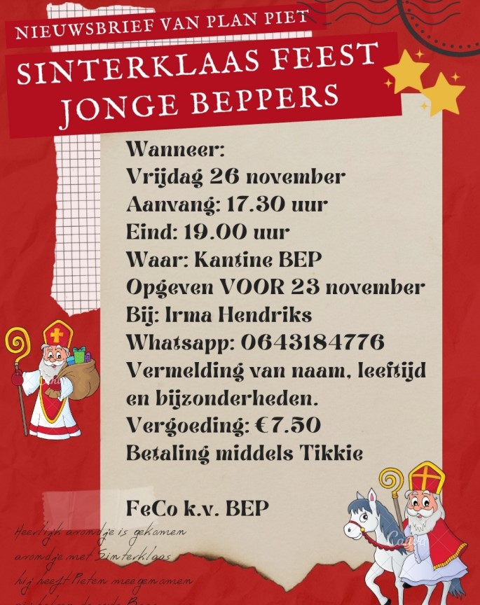 Sinterklaas komt ook dit jaar weer naar BEP! Wanneer: Op vrijdag 26 november, van 17.30 tot 19.00 uur in de kantine van kv BEP. Je moet je opgeven vóór 23 november bij Irma Hendriks (whatsapp: 0643184776...