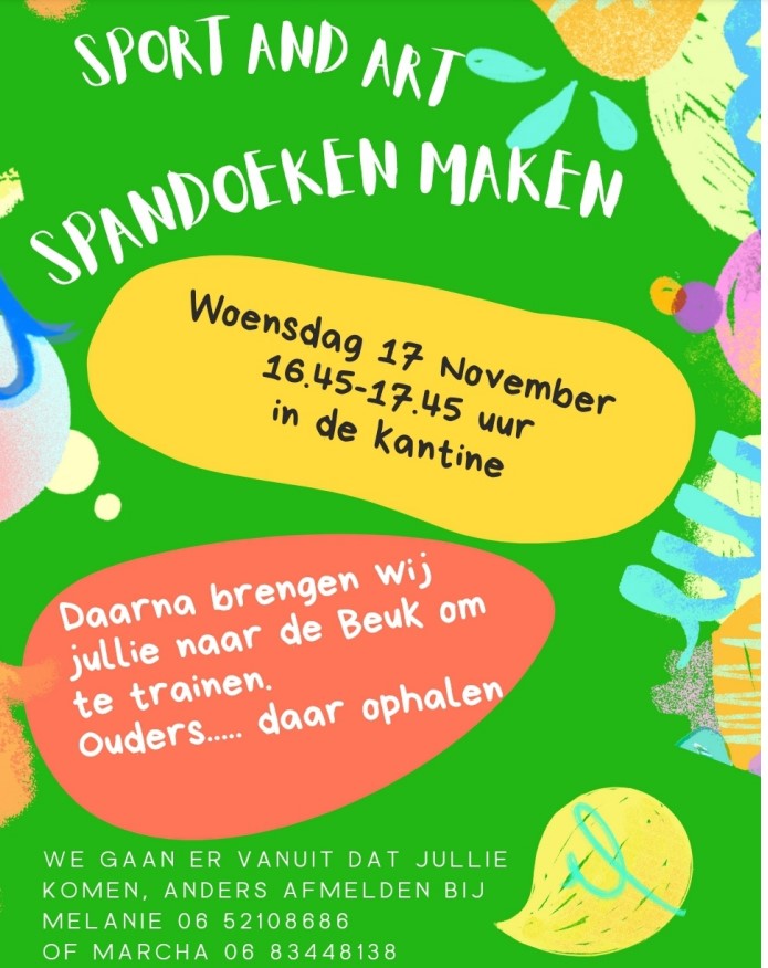 We gaan weer spandoeken maken, om BEP 1 en 2 in de zaal aan te moedigen. We maken de spandoeken (datum is gewijzigd!!) op woensdag 24 NOVEMBER, van 16.45 tot 17.45 uur, in de kantine!...
