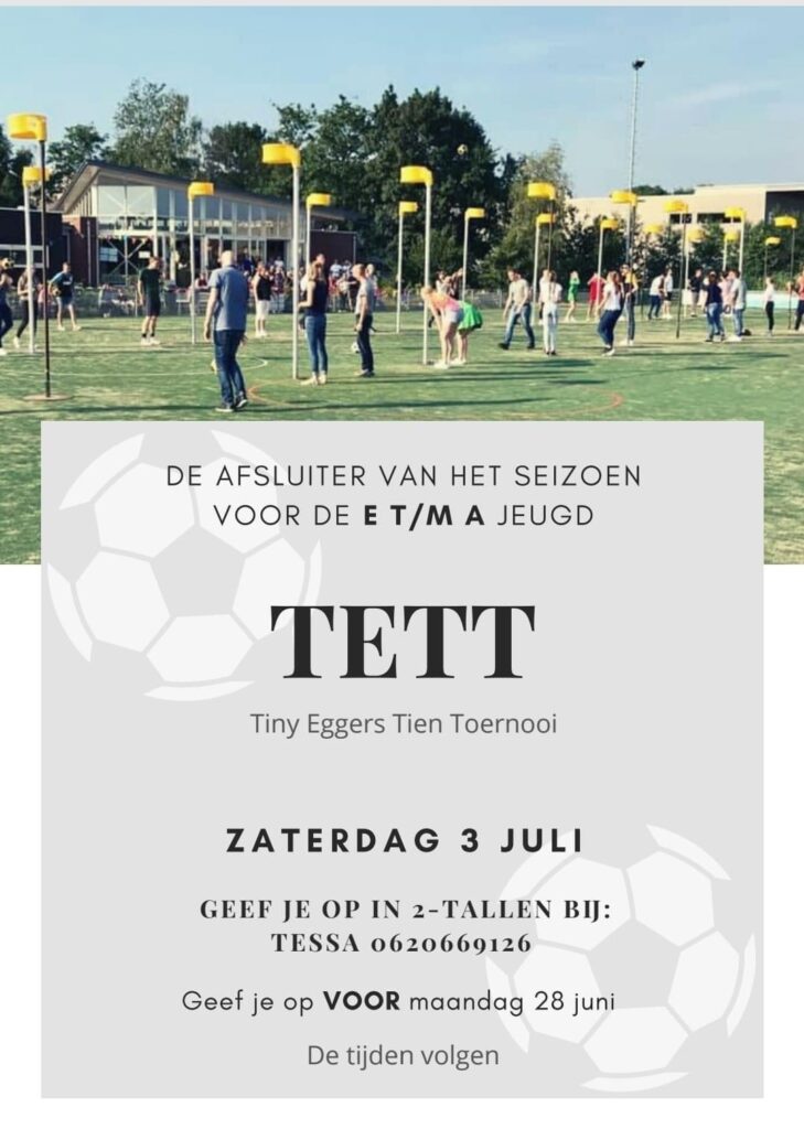 Zaterdag 3 juli is voor de E- t/m A-jeugd de afsluiter van het seizoen: Het Tiny Eggers Tien toernooi (TETT). Geef je op, in 2-tallen, bij Tessa: 0620669126 Wel graag vóór maandag 28 juni. De...