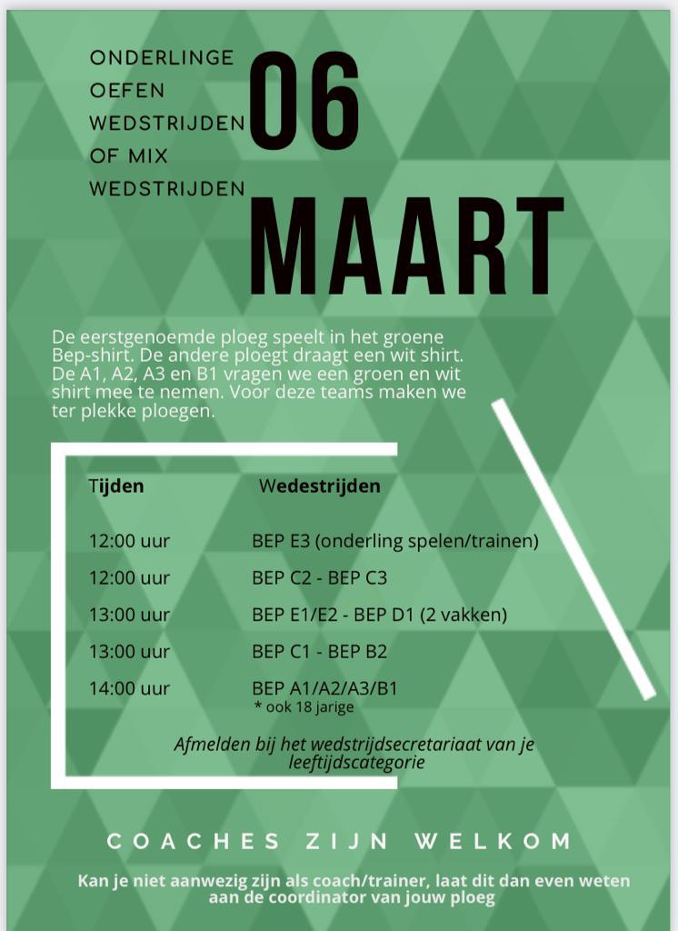 Zaterdag 6 maart zijn er onderlinge oefenwedstrijden en mix-wedstrijden op ons complex. Klik voor het speelschema en speeltijden op bovenstaand affiche. De eerst genoemde ploeg speel in het groene BEP—tenue en het andere team in...