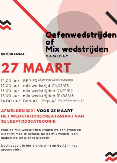 Op zaterdag 27 maart worden voor onze jeugdleden weer ‘Mix- en Oefenwedstrijden’ georganiseerd. Het programma ziet er als volgt uit: 00 uur E3 (Onderlinge wedstrijd,...