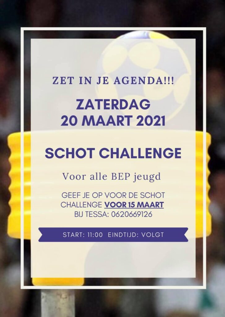 Zaterdag 20 maart vindt alweer het volgende evenement plaats: de “Schot Challenge”, voor alle BEP-Jeugd. Geef je vóór 15 maart op voor deze Challenge bij Tessa ( 06 20669126 ). De starttijd is die zaterdag...