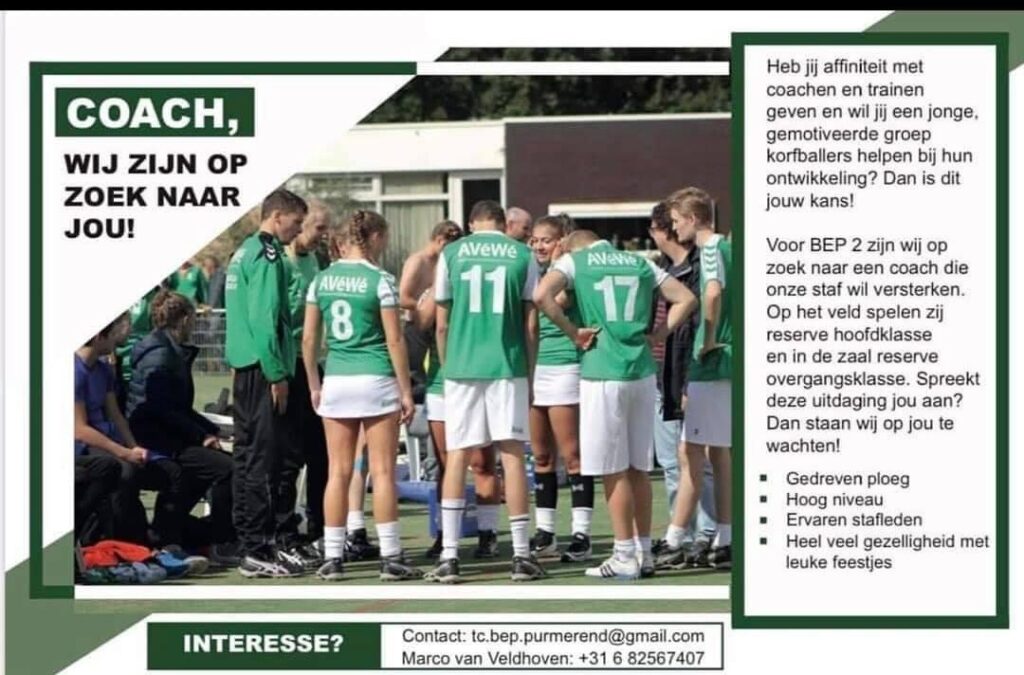 Vacature trainer/coach BEP 2: Ben jij op zoek naar een sportieve uitdaging als trainer/coach, wanneer het korfbalseizoen weer kan beginnen? Kijk dan even op het affiche hierboven!.